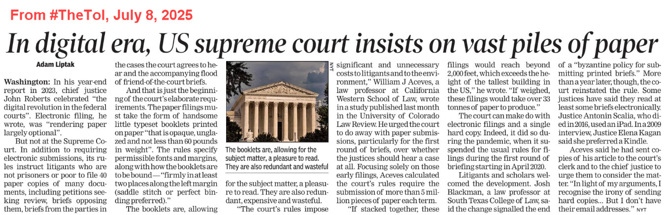 My view is that as a lawyer my job is to provide assistance to court for expeditious disposal of the case but too much of paper work which is presently expected from a lawyer practically turns him or her into clerk-lawyer. Very often a lawyer has to meet formal objections of court registry which are outrageous but you have to do it because your matter will not be listed unless you clear the objections. This is due to feudal system of providing complete paper book to “My Lords”. The digital technology enables the judicial system, if they so desire, which can consolidate all records, from court of first of first instance to the highest court, duly referenced so that court can directly go to the points of relevance. Frankly, not only courts but even our lawyer fraternity is not keen to improve the system. They want to continue with the system as it exists. My repeated suggestions that we should provide cost and time effective judicial system to litigants has no impact. Consider, what is necessity of going to Oath Commissioner when authenticity can be ensured online with digital signatures. All this requires a will to change which is presently lacking both in courts as well as legal fraternity. First, we have to create a feeling in us that we are duty bound to provide cost and time effective system to the parties seeking conflict resolution. Feudal mentality has to be given up, whether it is India, USA or elsewhere.